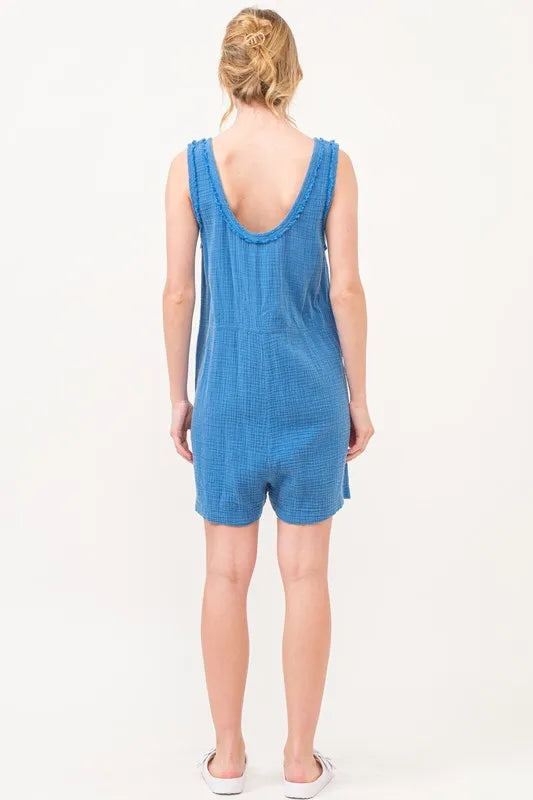 The washed gauze front button-down romper is a chic and comfortable one-piece outfit that is perfect for warm weather. The washed gauze fabric is lightweight and breathable, making it ideal for staying cool on hot days. The front button-down detailing adds a stylish touch to the romper, creating a trendy and effortless look. Rompers are a versatile choice for various occasions, as they can be dressed up with heels and accessories for a more polished ensemble or worn casually with sandals for a relaxed vibe. This piece is easy to style and can be a go-to option for a quick and stylish outfit. The washed gauze front button-down romper is a fashionable and practical choice for your summer wardrobe.